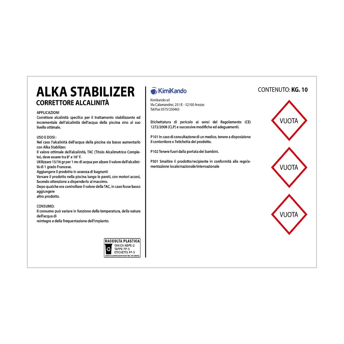 Alka Stabilizer è confezionato in un bidone da 10 kg realizzato in materiali riciclabili (HDPE-2 e PP-5). Durante la manipolazione, è fondamentale indossare idonei dispositivi di protezione individuale e seguire le raccomandazioni indicate nelle schede di sicurezza. Conservare sempre il prodotto fuori dalla portata dei bambini e smaltire il contenitore in conformità alle normative vigenti.