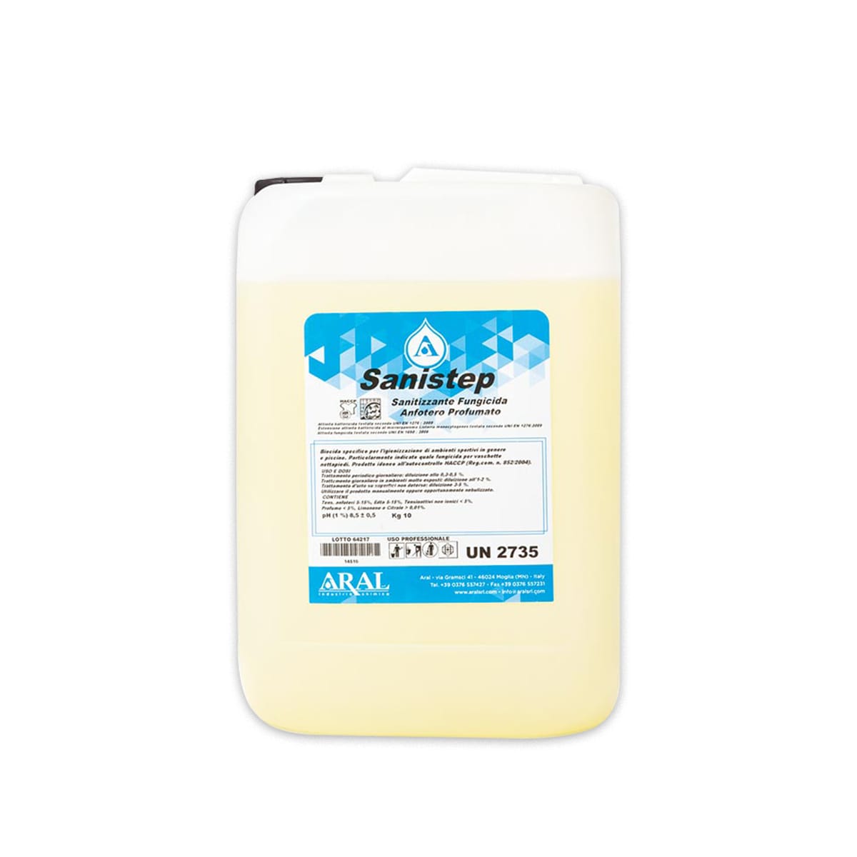 Sanistep è caratterizzato da un pH di 9,00 ± 0,5 e un peso specifico di 1,030 ± 0,01 g/ml. La presenza di tensioattivi non ionici (< 5%) e fragranze agrumate come Limonene e Citrale assicura un ambiente salubre e gradevolmente profumato. Prodotto da ARAL, il sanitizzante è conforme alle normative HACCP, facilitando la gestione dei protocolli di igiene professionale. La confezione da 10 kg  garantisce un’ottima autonomia operativa per la manutenzione ordinaria e straordinaria degli impianti.